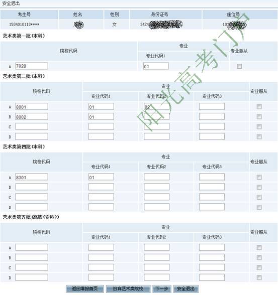 “放弃艺术类院校”按钮:放弃艺术类院校志愿,不填报艺术类的院校。一旦放弃,考生将不能被该类院校录取,请慎重操作。