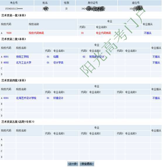 若考生志愿信息填报不合法,系统将以红色字体予以提示,且志愿信息无法提交,考生须点击“上一步”回到志愿填报界面进行修改,修改完毕再次进入志愿校对页面。