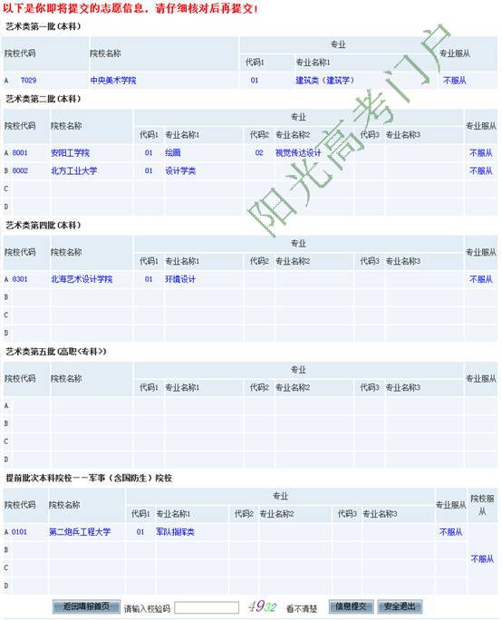 请考生务必再次仔细核对自己的信息,确认无误后输入校验码并点击“信息提交”按钮提交志愿信息,信息一旦提交将无法重填或修改,请慎重操作。