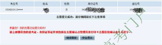 信息提交成功后将看到下面的页面,如果下面的页面没有出现,可能您的志愿没有填报成功,请到志愿填报点老师处咨询。