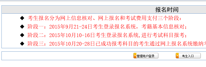◆ 阶段一:2015年9月21-24日考生登录报名系统,考籍基本信息核对;