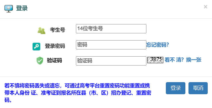 若不慎将密码丢失或遗忘,可通过高考平台重置密码功能重置或携带本人身份 证、准考证到报名所在县(市、区)招办登记、重置密码。