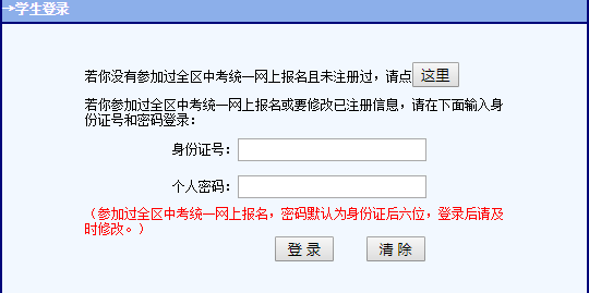 若你参加过全区中考统一网上报名或要修改已注册信息,请在下面输入身份证号和密码登录: