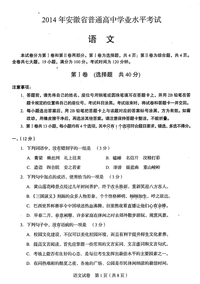 安徽省2014年普通高中学业水平考试语文试题及答案