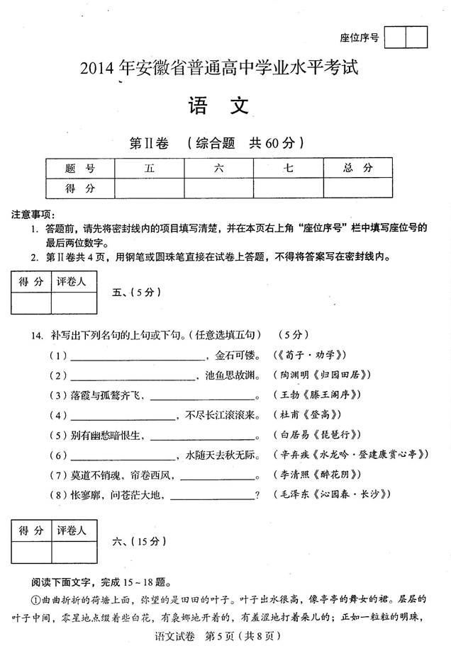 安徽省2014年普通高中学业水平考试语文试题及答案(5)