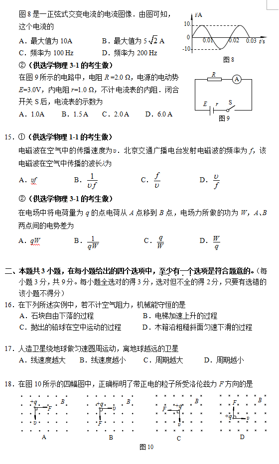 2014年北京市夏季普通高中会考物理试题及标准答案(3)
