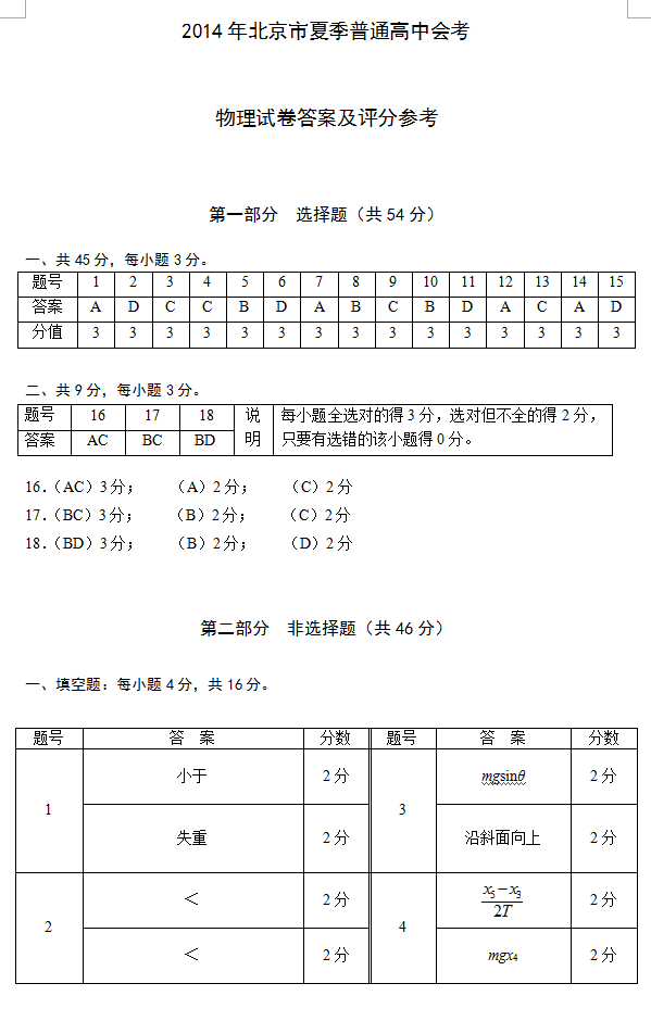 2014年北京市夏季普通高中会考物理试题及标准答案(7)