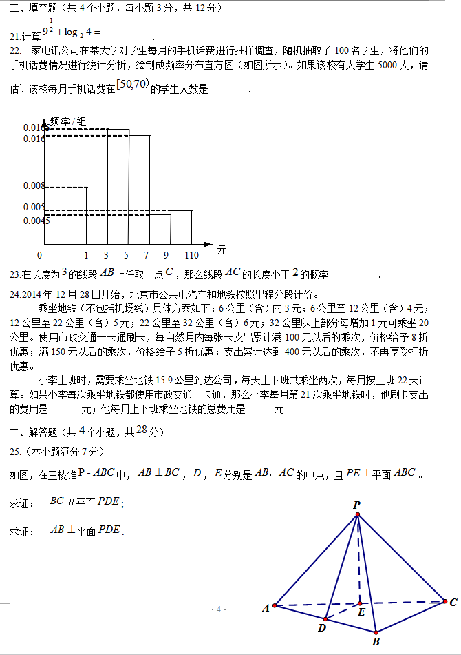 北京市2015年春季普通高中会考数学试卷及答案(4)