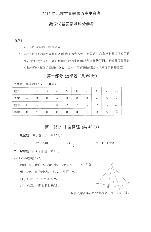 北京市2015年春季普通高中会考数学试卷及答案(6)
