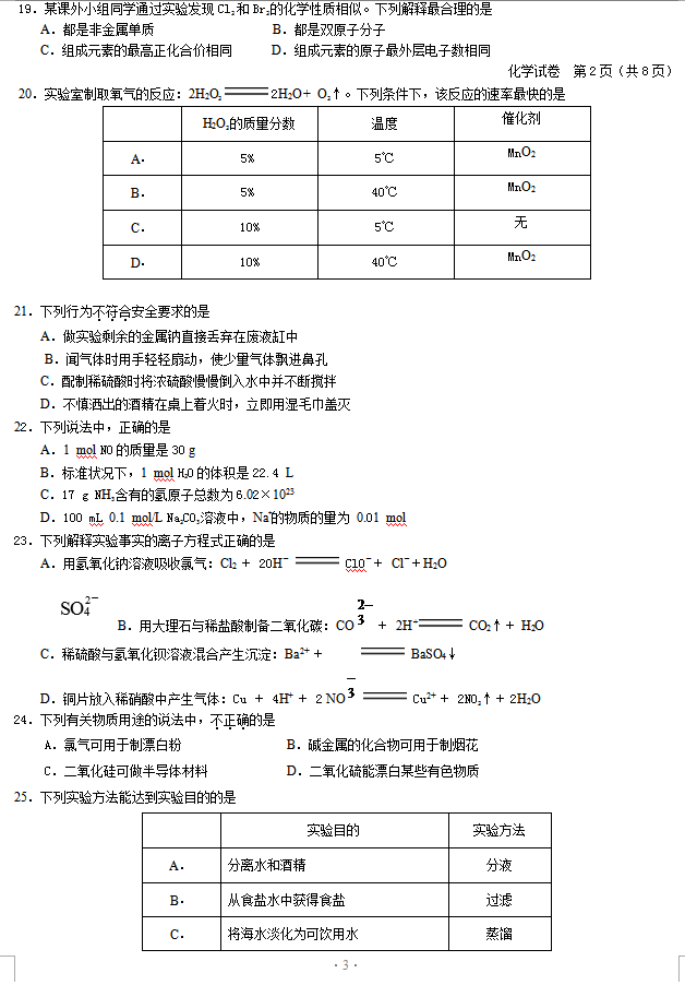 北京市普通高中2015年春季会考化学试题及答案(3)