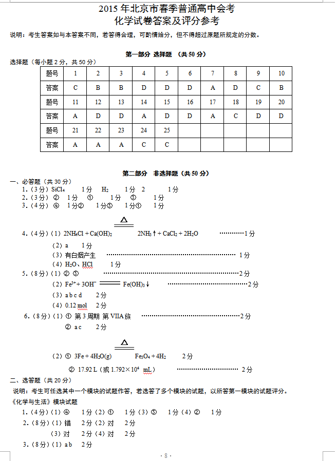 北京市普通高中2015年春季会考化学试题及答案(8)