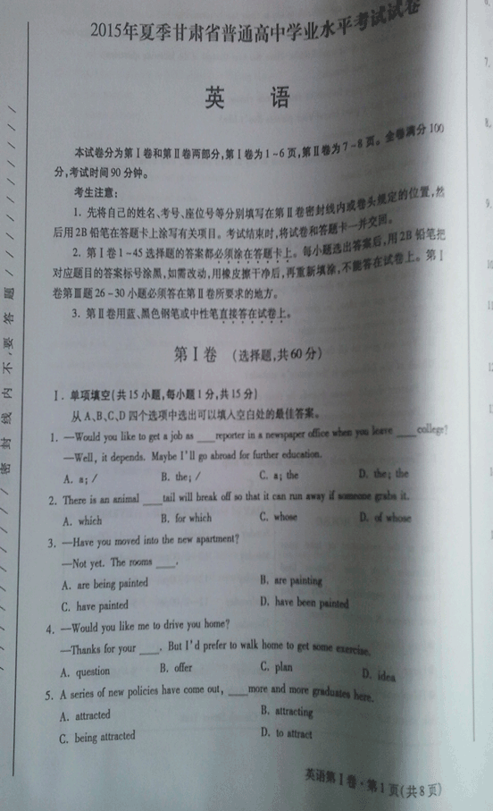 甘肃省2015年夏季高中学业水平考试英语试题(扫描版)