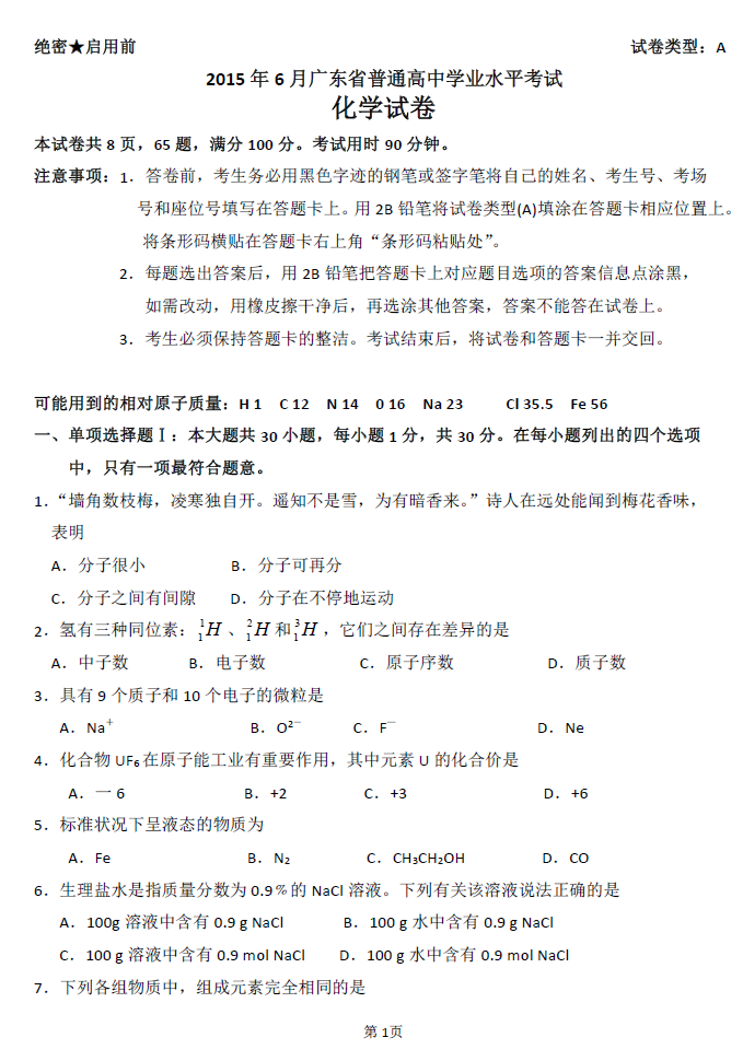 2015年6月广东省普通高中学业水平考试化学试题及答案
