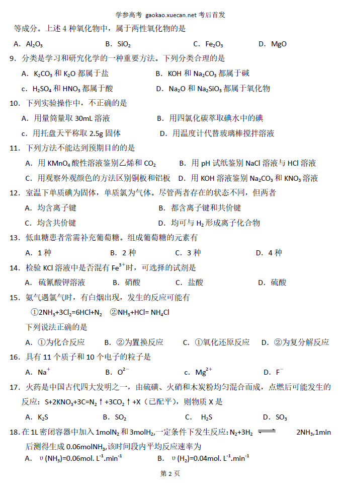 2016年6月广东省普通高中学业水平考试化学试卷真题及答案(下载)(2)