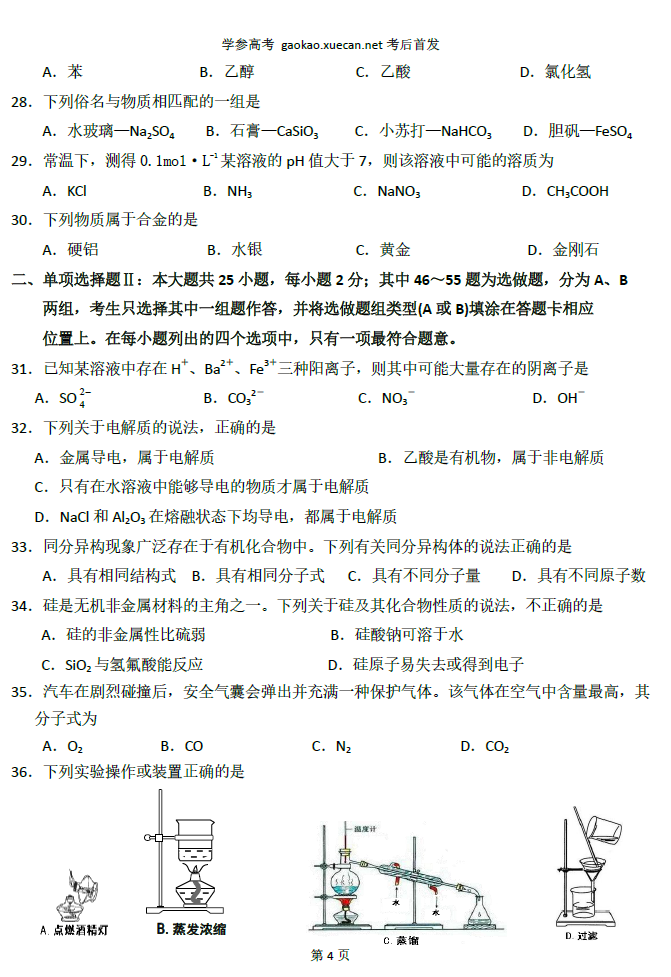 2016年6月广东省普通高中学业水平考试化学试卷真题及答案(下载)(4)