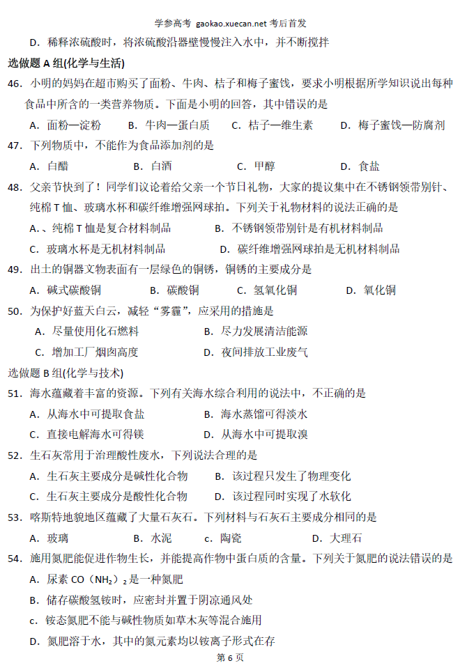 2016年6月广东省普通高中学业水平考试化学试卷真题及答案(下载)(6)