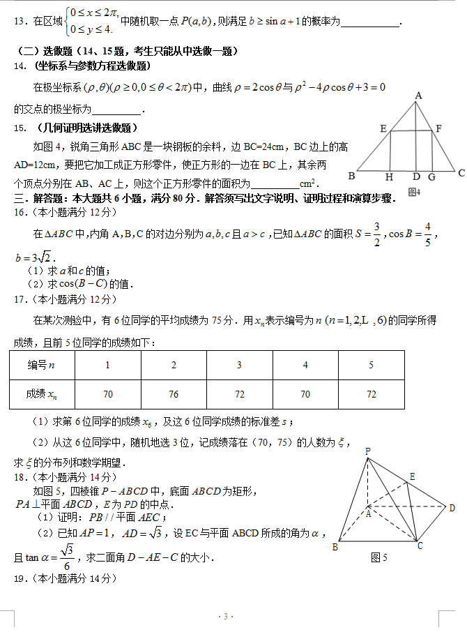 广东揭阳2014-2015学年度高中三年级学业水平考试理科数学试题(3)