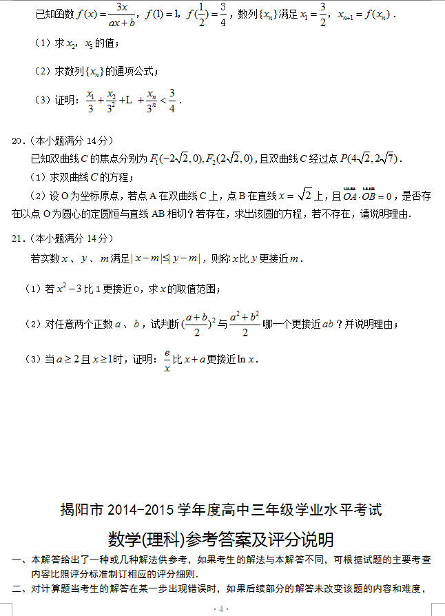 广东揭阳2014-2015学年度高中三年级学业水平考试理科数学试题(4)