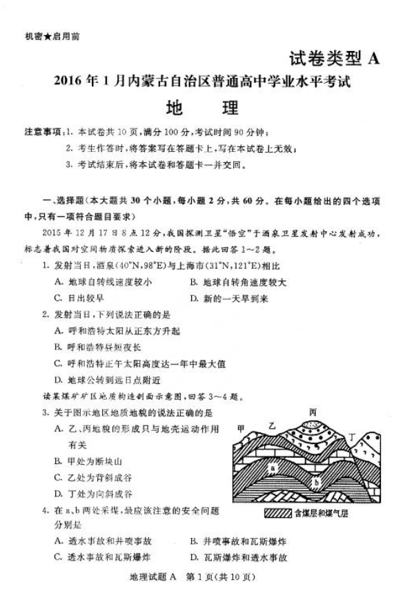 内蒙古自治区2016年1月普通高中学业水平考试地理试题及答案
