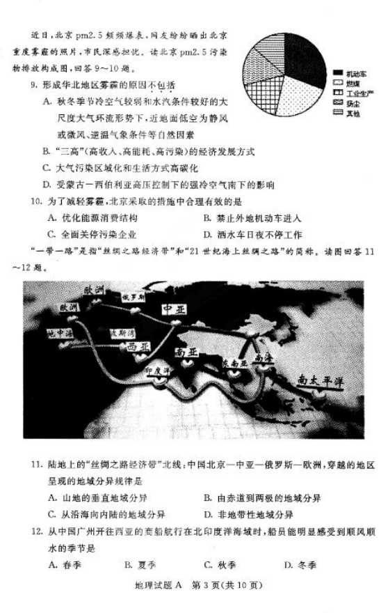 内蒙古自治区2016年1月普通高中学业水平考试地理试题及答案(3)