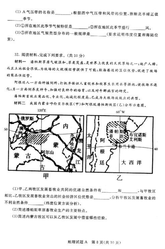 内蒙古自治区2016年1月普通高中学业水平考试地理试题及答案(8)
