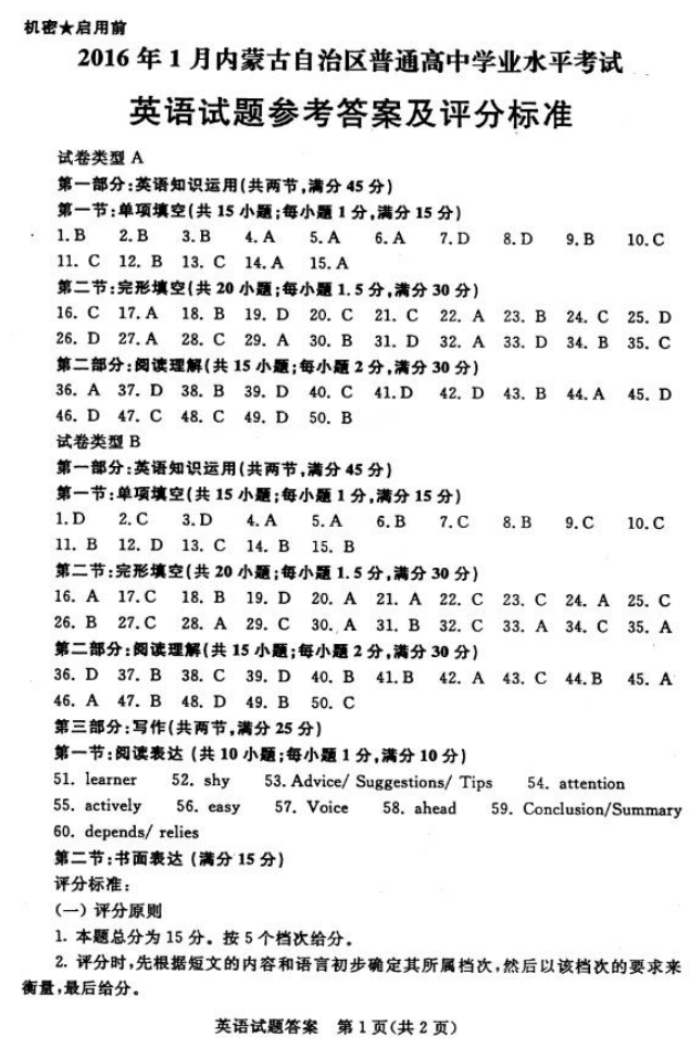 内蒙古2016年1月普通高中学业水平考试英语试题及答案(11)