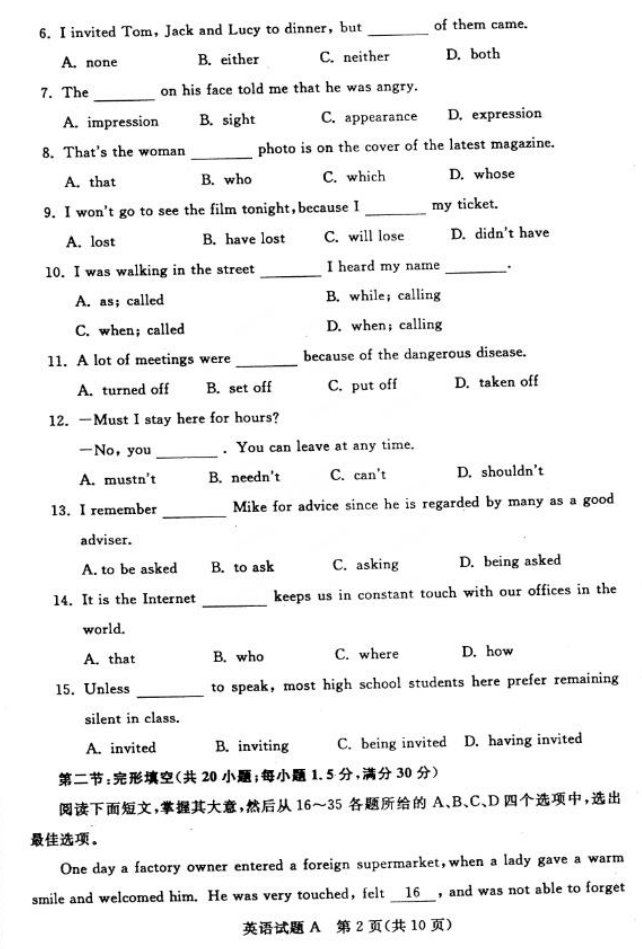 内蒙古2016年1月普通高中学业水平考试英语试题及答案(2)