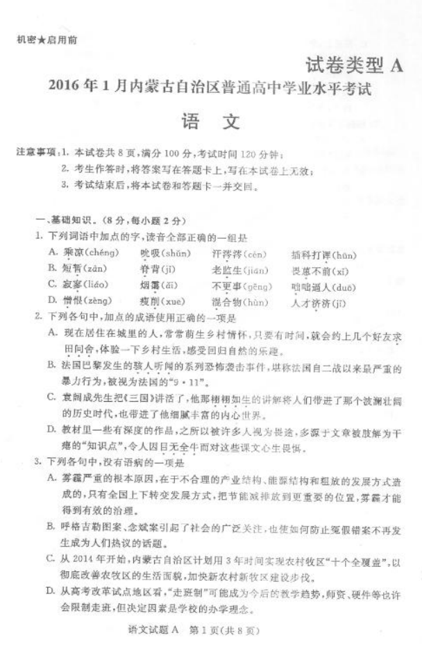 内蒙古2016年1月普通高中学业水平考试语文试题及答案