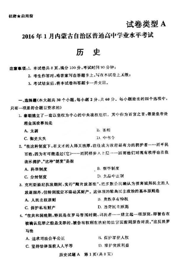 内蒙古自治区2016年1月普通高中学业水平考试历史试题及答案