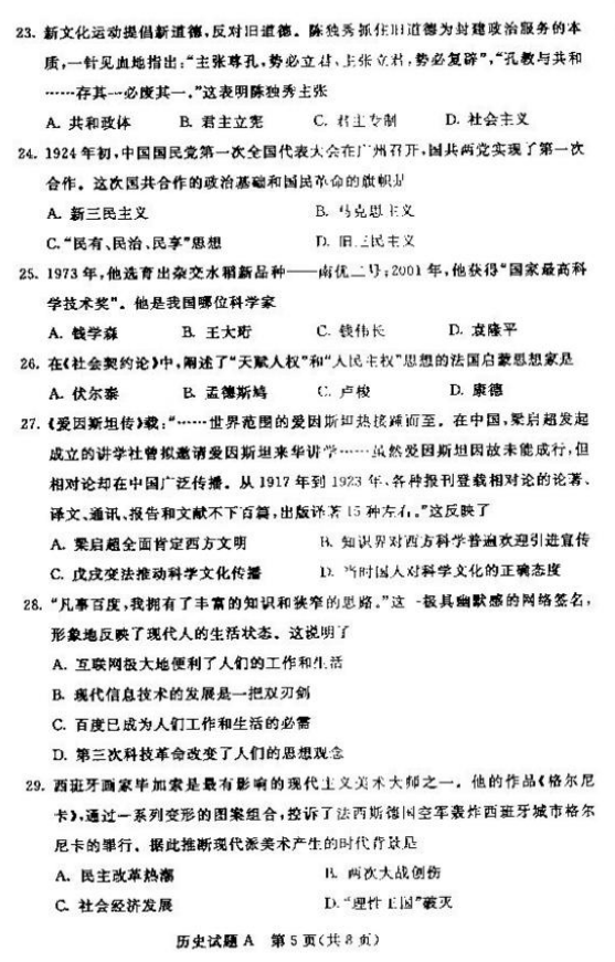内蒙古自治区2016年1月普通高中学业水平考试历史试题及答案(5)