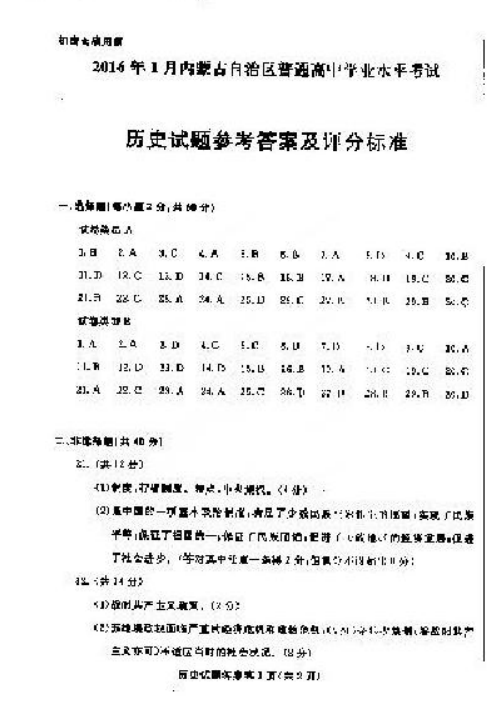 内蒙古自治区2016年1月普通高中学业水平考试历史试题及答案(9)