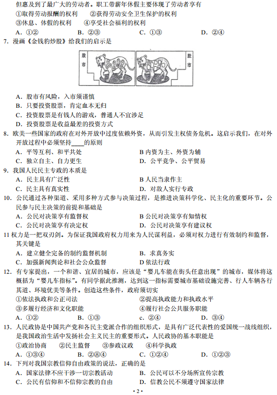 云南省2015年1月普通高中学业水平考试政治试题及答案(2)