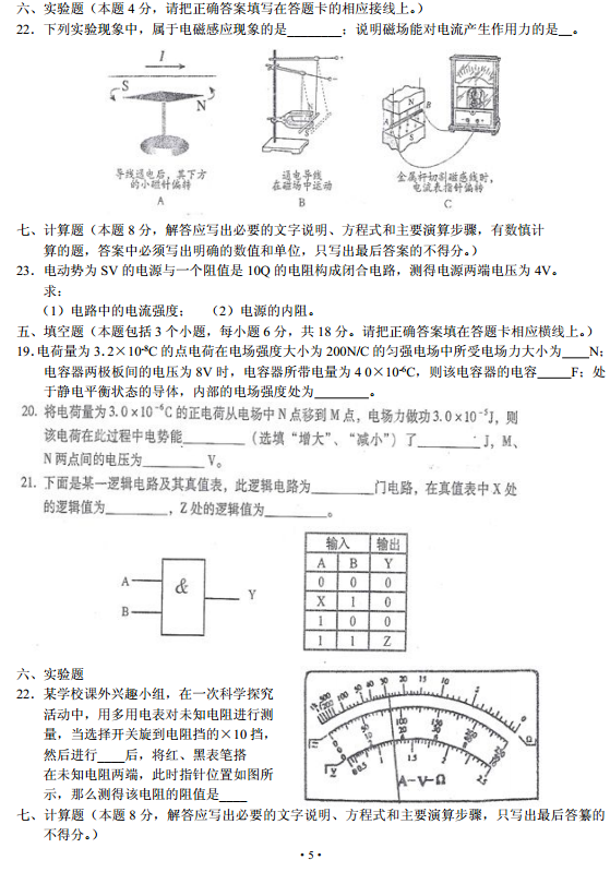 云南省2015年1月普通高中学业水平考试物理试题及答案(5)