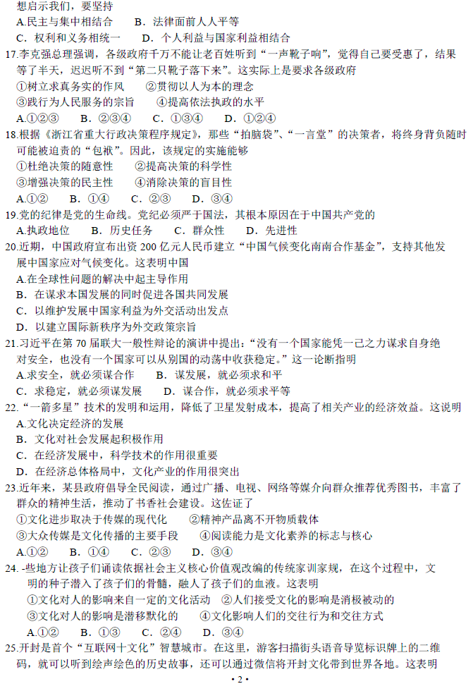 2015年10月浙江省普通高中招生选考科目考试试思想政治试题及答案(3)
