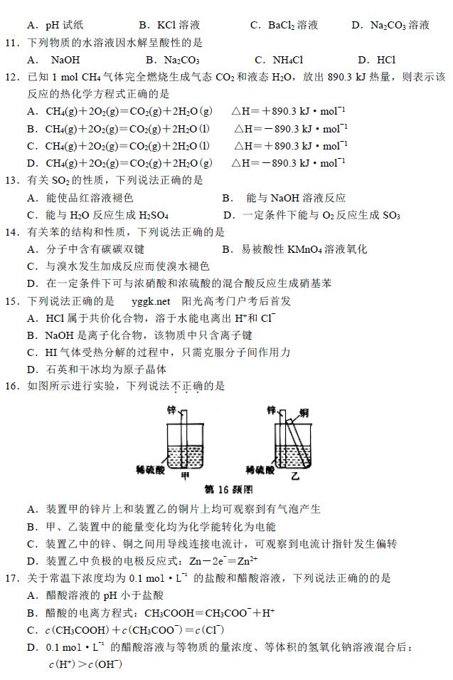 浙江省2015年10月高中学业水平考试化学试题及答案(2)