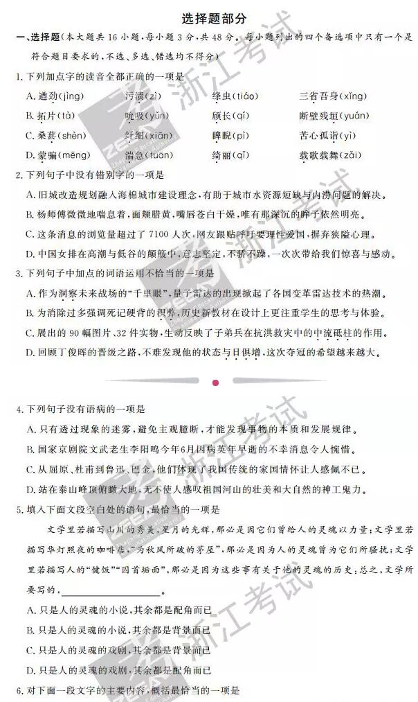 2016年10月浙江省普通高中学业水平考试语文试题及答案