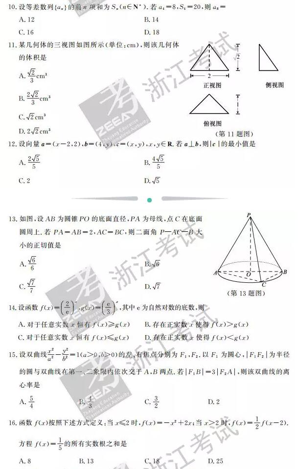 浙江省2016年10月普通高校招生选考科目考试数学试题及答案(2)
